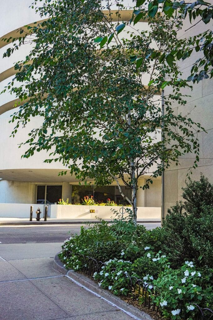 Layered planting frames views of the Solomon R. Guggenheim Museum along Fifth Avenue, introducing softness and seasonal variation while maintaining a clear relationship to its iconic form.